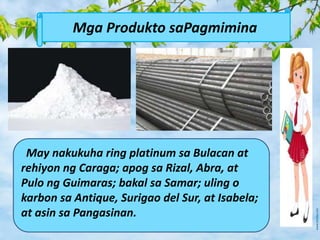 Produkto o kalakal saquezon. Pulo ng Guimaras uling o karbon sa Antique karbon sa Quezon at pulo ng Batanes Bukod sa pagsasaka pagtatanim pangingisda at pagmimina ang mga tao ay nabubuhay rin sa pag-aalaga ng mga hayop at pagtitinda ng mga produktong yari o gawa sa komunidad. Plaza Miranda e. Bangui Windmills Ng Ilocos Norte4.